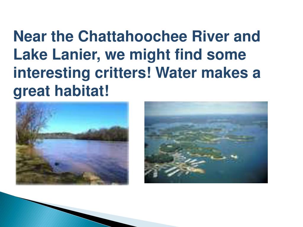 Near the Chattahoochee River and Lake Lanier, we might find some interesting critters! Water makes a great habitat!