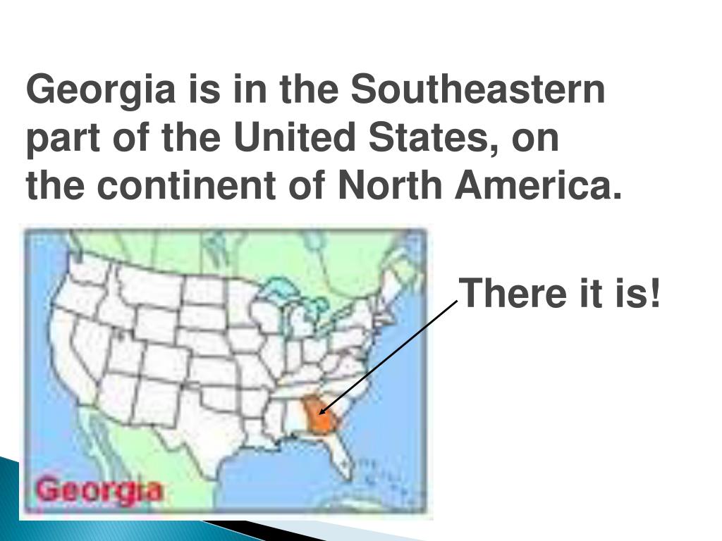 Georgia is in the Southeastern part of the United States, on the continent of North America. There it is!