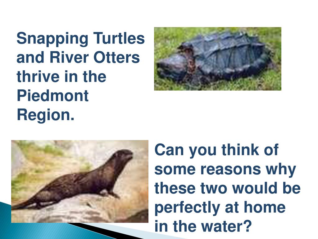 Snapping Turtles and River Otters thrive in the Piedmont Region. Can you think of some reasons why these two would be perfectly at home in the water?