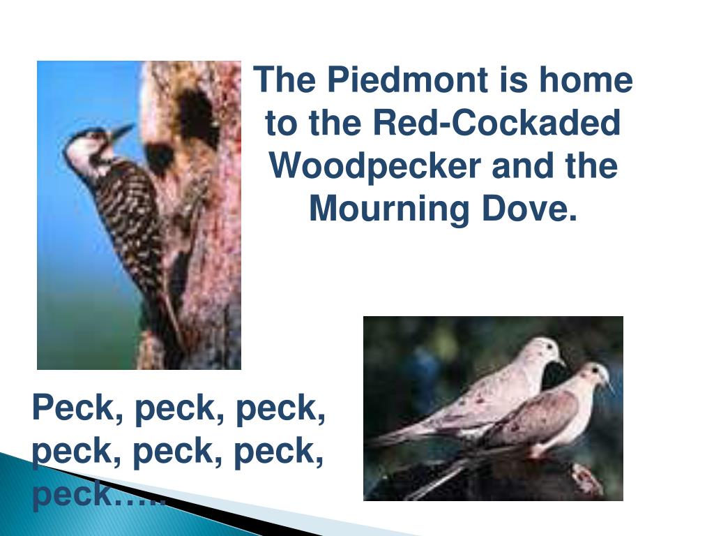 The Piedmont is home to the Red-Cockaded Woodpecker and the Mourning Dove. Peck, peck, peck, peck, peck, peck, peck…..