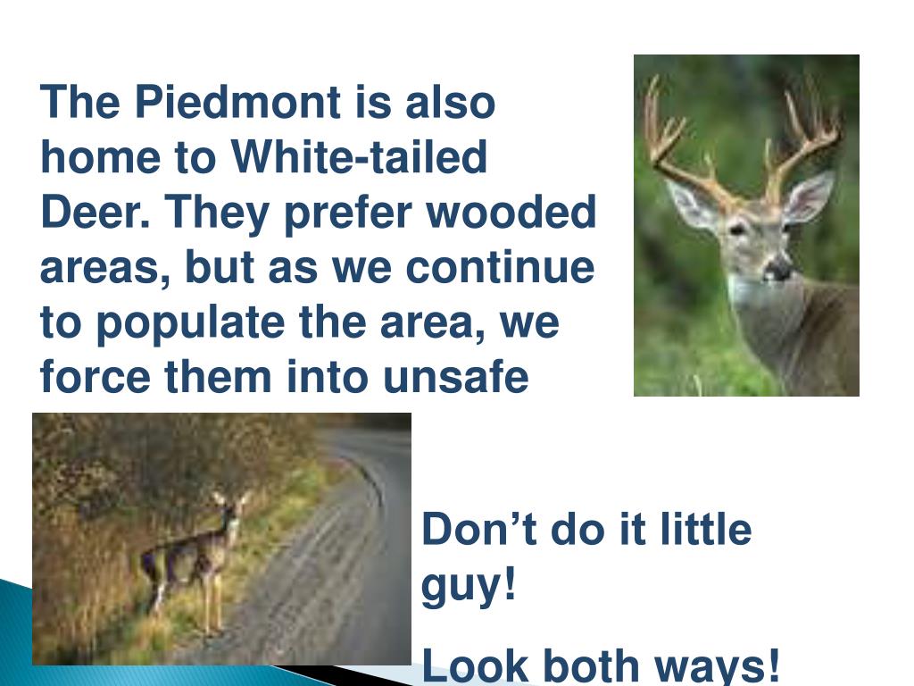 The Piedmont is also home to White-tailed Deer. They prefer wooded areas, but as we continue to populate the area, we force them into unsafe territory. Don’t do it little guy! Look both ways!