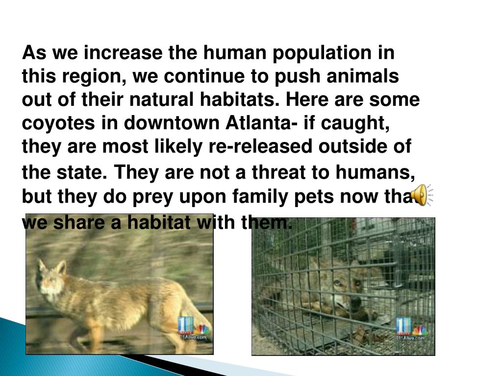 As we increase the human population in this region, we continue to push animals out of their natural habitats. Here are some coyotes in downtown Atlanta- if caught, they are most likely re-released outside of the state.They are not a threat to humans, but they do prey upon family pets now that we share a habitat with them.