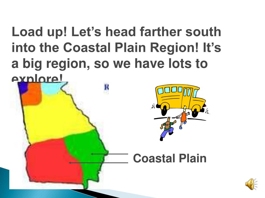Load up! Let’s head farther south into the Coastal Plain Region! It’s a big region, so we have lots to explore! Coastal Plain