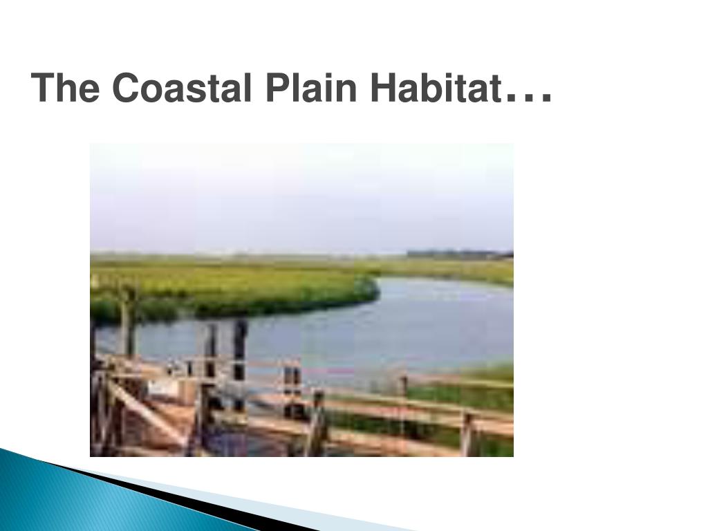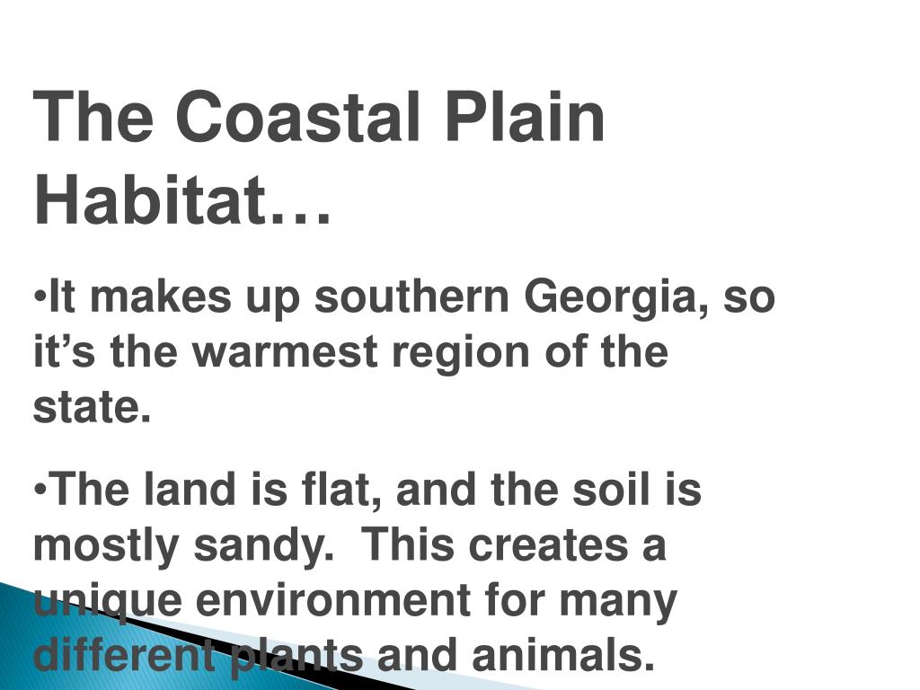 The Coastal Plain Habitat… • It makes up southern Georgia, so it’s the warmest region of the state. • The land is flat, and the soil is mostly sandy. This creates a unique environment for many different plants and animals. • It’s a great region to vacation in. Can you think of some reasons why?