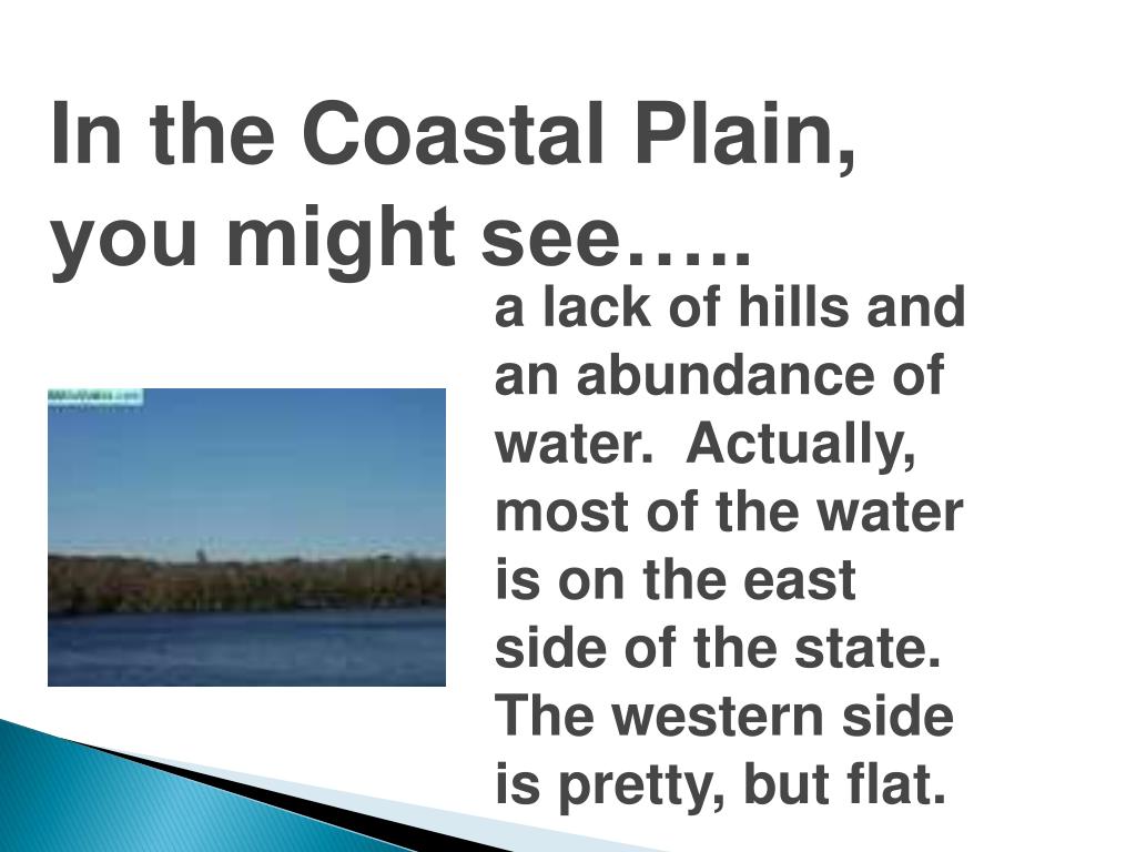 In the Coastal Plain, you might see….. a lack of hills and an abundance of water. Actually, most of the water is on the east side of the state. The western side is pretty, but flat.