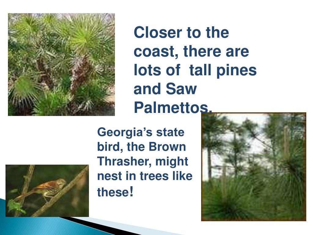 Closer to the coast, there are lots of tall pines and Saw Palmettos. Georgia’s state bird, the Brown Thrasher, might nest in trees like these!