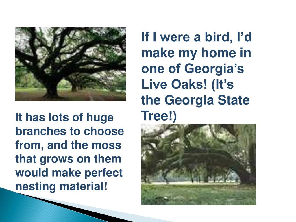 If I were a bird, I’d make my home in one of Georgia’s Live Oaks! (It’s the Georgia State Tree!) It has lots of huge branches to choose from, and the moss that grows on them would make perfect nesting material!