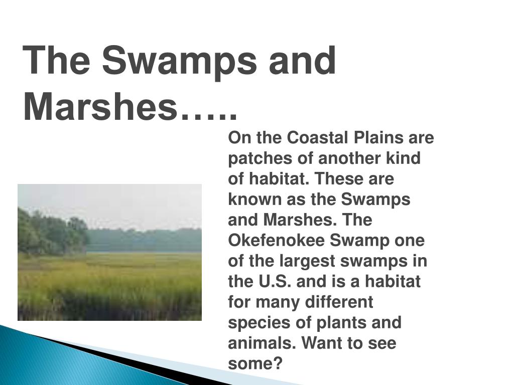The Swamps and Marshes….. On the Coastal Plains are patches of another kind of habitat. These are known as the Swamps and Marshes. The Okefenokee Swamp one of the largest swamps in the U.S. and is a habitat for many different species of plants and animals. Want to see some?