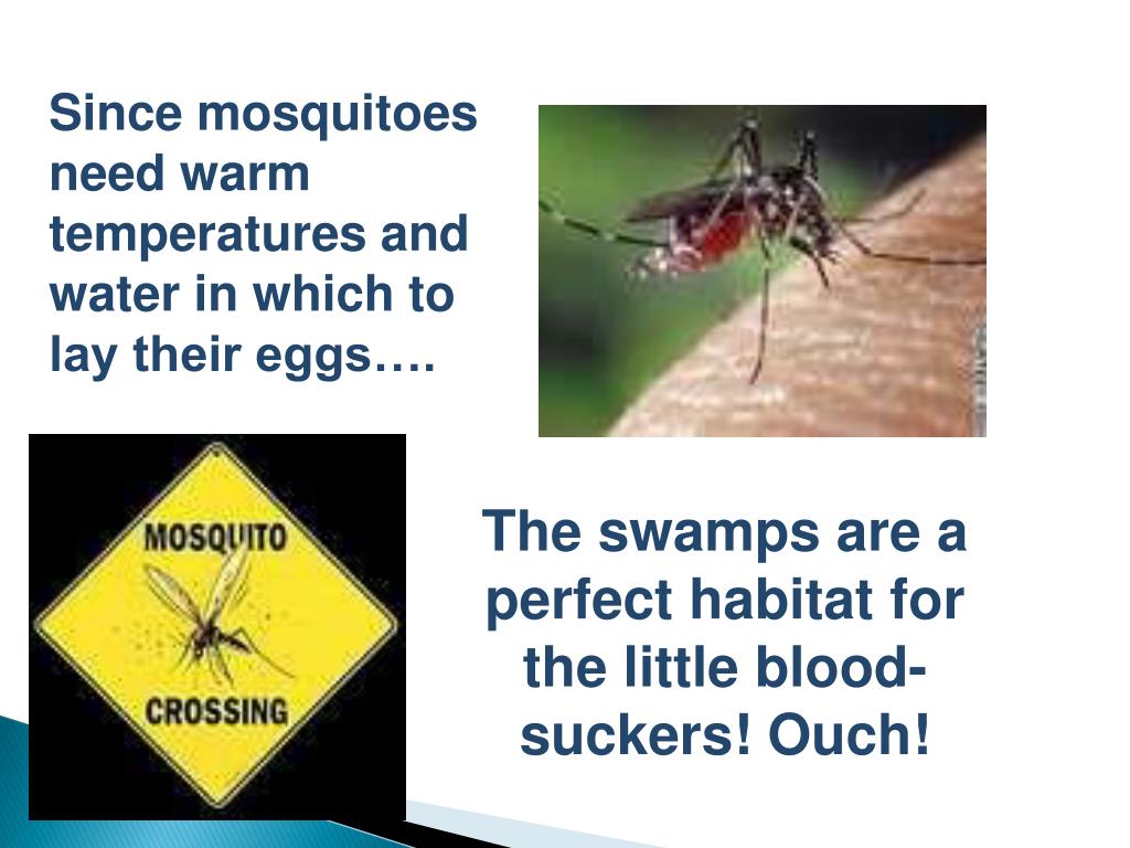 Since mosquitoes need warm temperatures and water in which to lay their eggs…. The swamps are a perfect habitat for the little blood-suckers! Ouch!
