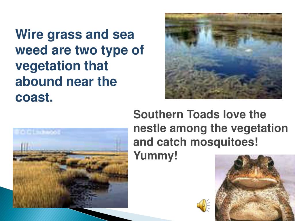 Wire grass and sea weed are two type of vegetation that abound near the coast. Southern Toads love the nestle among the vegetation and catch mosquitoes! Yummy!