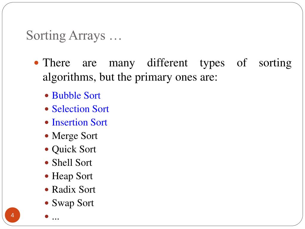 Sorting Arrays … • There are many different types of sorting algorithms, but the primary ones are: • Bubble Sort • Selection Sort • Insertion Sort • Merge Sort • Quick Sort • Shell Sort • Heap Sort • Radix Sort • Swap Sort • ...