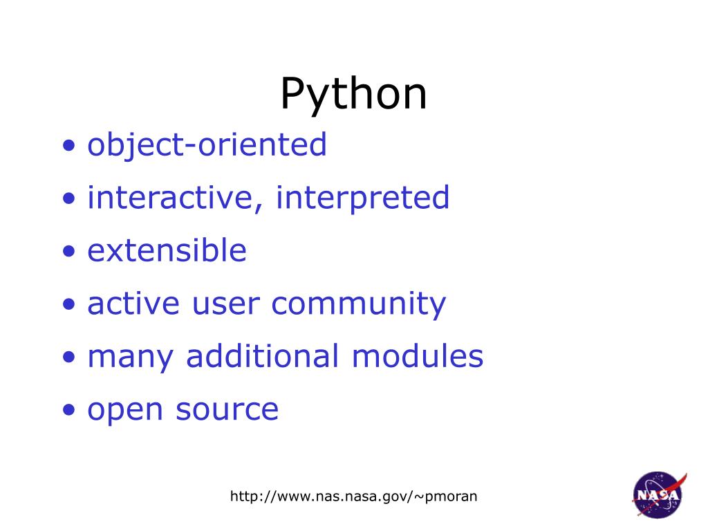 Python • object-oriented • interactive, interpreted • extensible • active user community • many additional modules • open source http://www.nas.nasa.gov/~pmoran