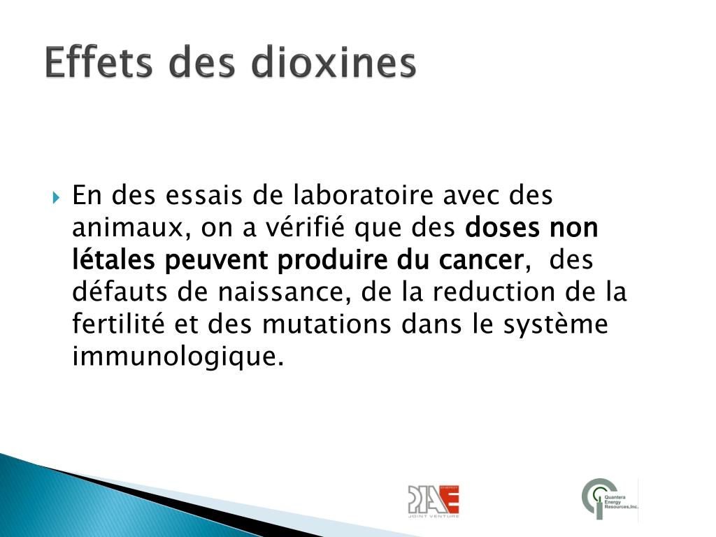 Effets des dioxines • En des essais de laboratoireavec des animaux, on a vérifié que des doses non létalespeuventproduire du cancer, des défauts de naissance, de la reduction de la fertilité et des mutationsdans le systèmeimmunologique.