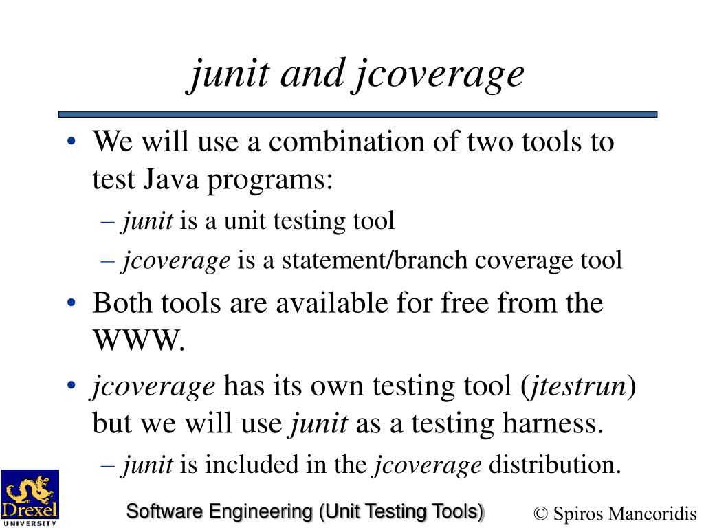 junit and jcoverage • We will use a combination of two tools to test Java programs: • junit is a unit testing tool • jcoverage is a statement/branch coverage tool • Both tools are available for free from the WWW. • jcoverage has its own testing tool (jtestrun) but we will use junit as a testing harness. • junit is included in the jcoverage distribution. Software Engineering (Unit Testing Tools)