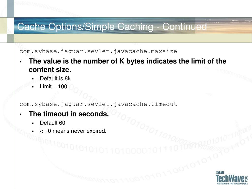 Cache Options/Simple Caching - Continued com.sybase.jaguar.sevlet.javacache.maxsize • The value is the number of K bytes indicates the limit of the content size. • Default is 8k • Limit – 100 com.sybase.jaguar.sevlet.javacache.timeout • The timeout in seconds. • Default 60 • <= 0 means never expired.