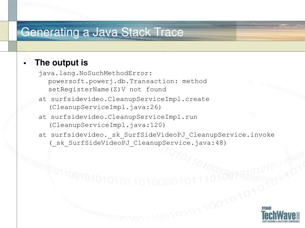 Generating a Java Stack Trace • The output is java.lang.NoSuchMethodError: powersoft.powerj.db.Transaction: method setRegisterName(Z)V not found at surfsidevideo.CleanupServiceImpl.create (CleanupServiceImpl.java:26) at surfsidevideo.CleanupServiceImpl.run (CleanupServiceImpl.java:120) at surfsidevideo._sk_SurfSideVideoPJ_CleanupService.invoke (_sk_SurfSideVideoPJ_CleanupService.java:48)