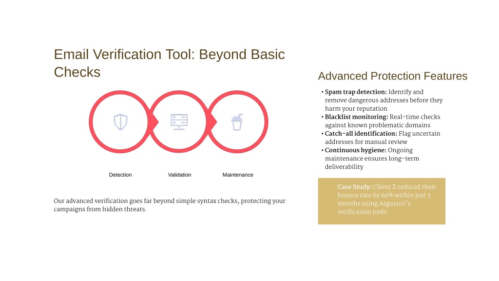 Email Verification Tool: Beyond Basic Checks Advanced Protection Features • Spam trap detection: Identify and remove dangerous addresses before they harm your reputation • Blacklist monitoring: Real-time checks against known problematic domains • Catch-all identification: Flag uncertain addresses for manual review • Continuous hygiene: Ongoing maintenance ensures long-term deliverability Detection Validation Maintenance Case Study: Client X reduced their bounce rate by 60% within just 3 months using Argus101's verification tools Our advanced verification goes far beyond simple syntax checks, protecting your campaigns from hidden threats.