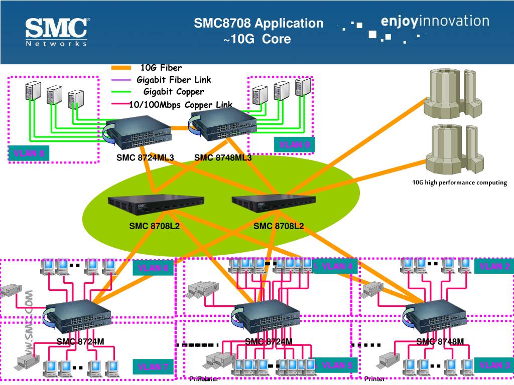 SMC 8708L2 VLAN 2 10G Fiber Gigabit Fiber Link Gigabit Copper VLAN 3 10/100Mbps Copper Link Printer SMC8708 Application ~10G Core VLAN 9 VLAN 8 SMC 8724ML3 SMC 8748ML3 10G high performance computing SMC 8708L2 VLAN 4 VLAN 4 VLAN 6 SMC 8724M SMC 8724M SMC 8748M VLAN 5 VLAN 5 VLAN 7 Printer Printer