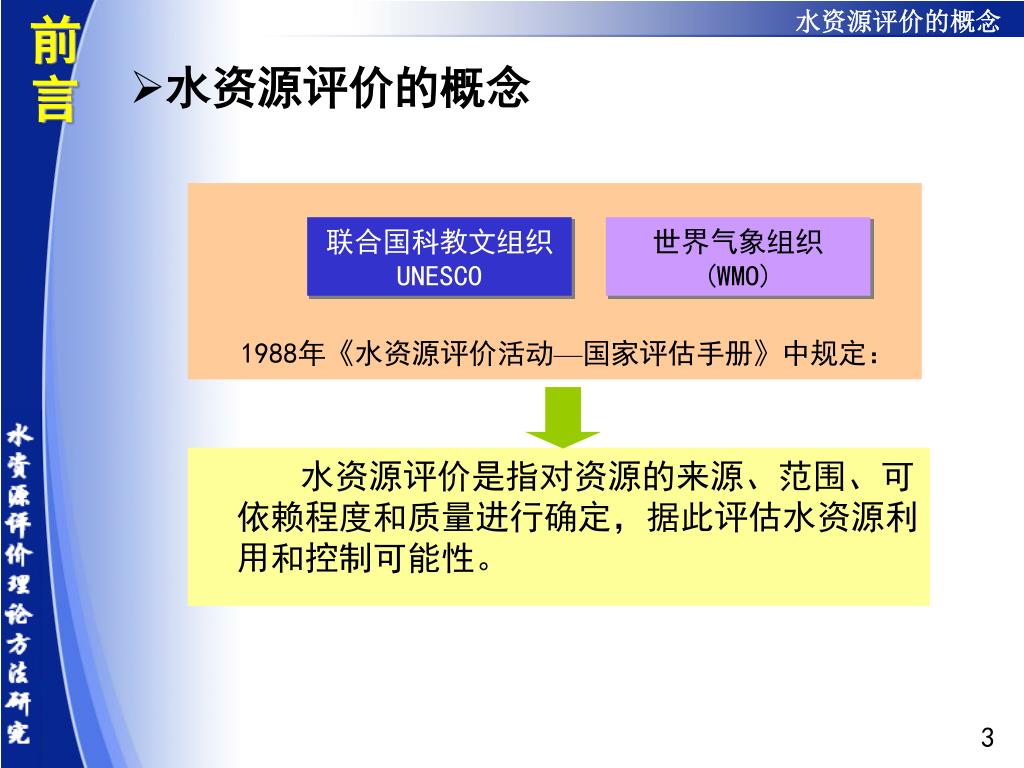 前言 水资源评价的概念 • 水资源评价的概念 1988年《水资源评价活动—国家评估手册》中规定: 联合国科教文组织 UNESCO 世界气象组织 (WMO) 水资源评价是指对资源的来源、范围、可依赖程度和质量进行确定,据此评估水资源利用和控制可能性。