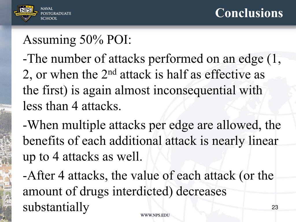 Conclusions Assuming 50% POI: -The number of attacks performed on an edge (1, 2, or when the 2nd attack is half as effective as the first) is again almost inconsequential with less than 4 attacks. -When multiple attacks per edge are allowed, the benefits of each additional attack is nearly linear up to 4 attacks as well. -After 4 attacks, the value of each attack (or the amount of drugs interdicted) decreases substantially P