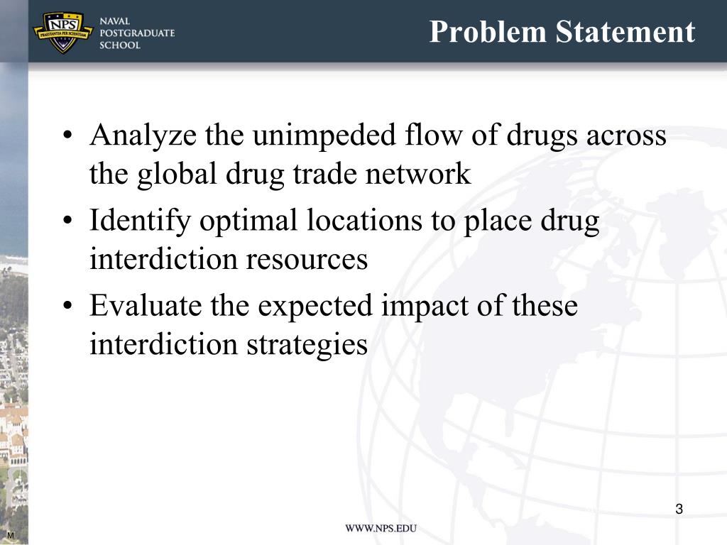 Problem Statement • Analyze the unimpeded flow of drugs across the global drug trade network • Identify optimal locations to place drug interdiction resources • Evaluate the expected impact of these interdiction strategies M