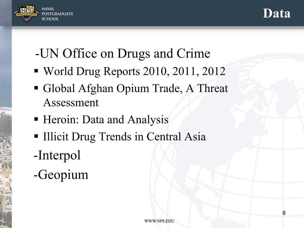 Data -UN Office on Drugs and Crime • World Drug Reports 2010, 2011, 2012 • Global Afghan Opium Trade, A Threat Assessment • Heroin: Data and Analysis • Illicit Drug Trends in Central Asia -Interpol -Geopium P