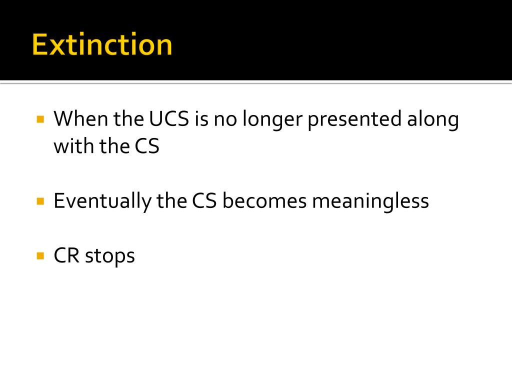 Extinction • When the UCS is no longer presented along with the CS • Eventually the CS becomes meaningless • CR stops
