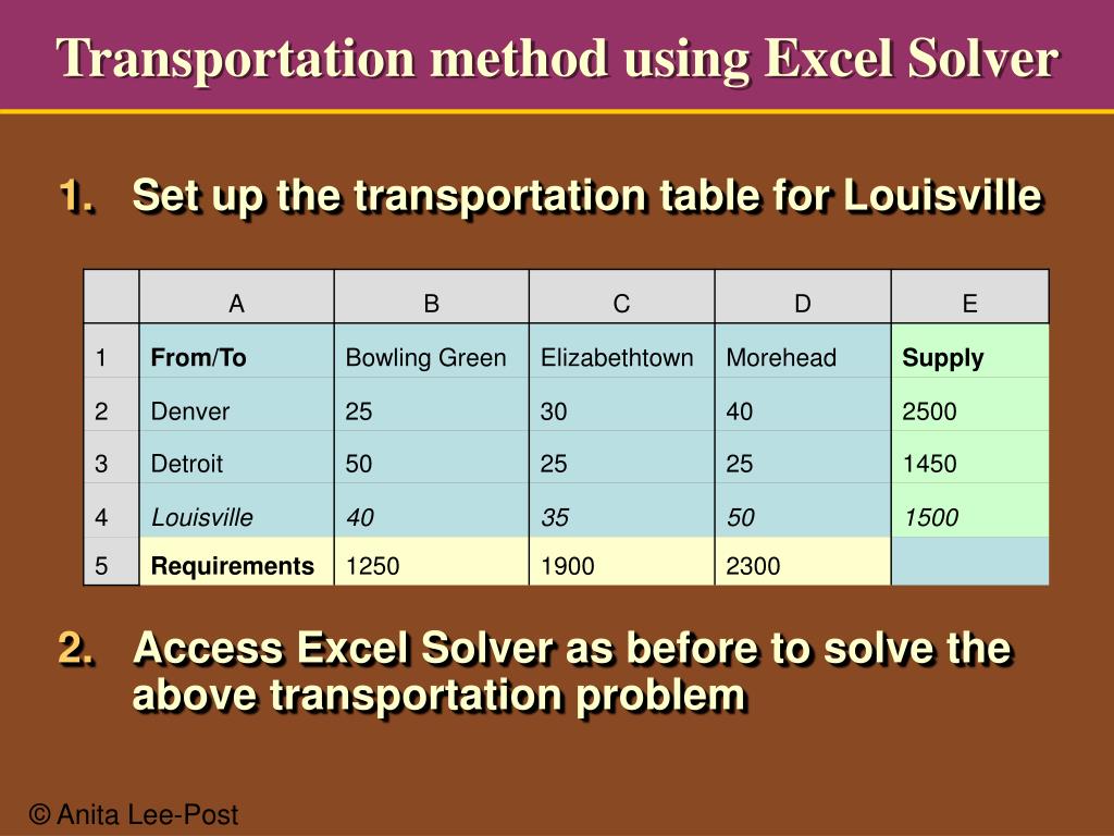 Transportation method using Excel Solver Shipping schedule Lexington cost