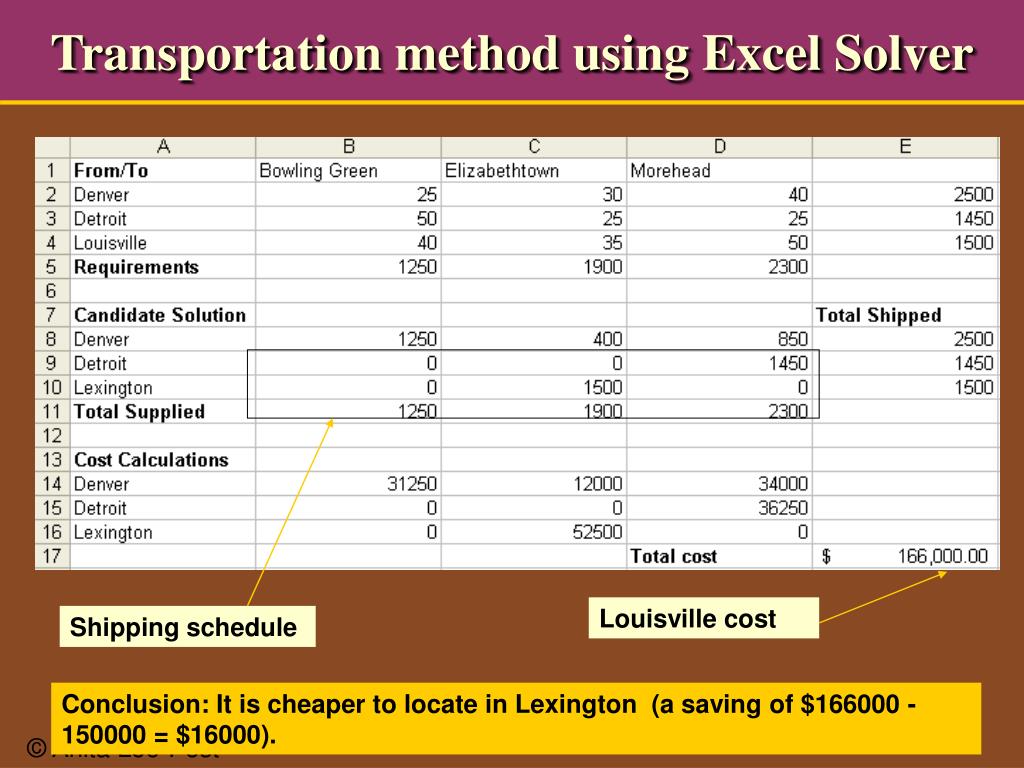 Transportation method using Excel Solver Louisville cost Shipping schedule Conclusion: It is cheaper to locate in Lexington (a saving of $166000 -150000 = $16000).