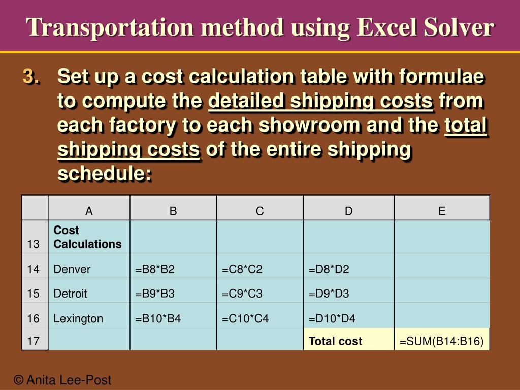 Transportation method using Excel Solver • Set up a cost calculation table • Detailed shipping costs from each source to each destination; • Total cost of the shipping schedule.