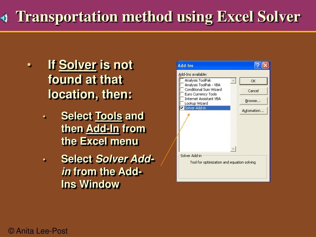 Transportation method using Excel Solver • If Solver is not found at that location, then: • Select Tools and then Add-In from the Excel menu • Select Solver Add-in from the Add-Ins Window