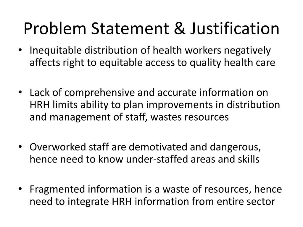 Problem Statement & Justification • Inequitable distribution of health workers negatively affects right to equitable access to quality health care • Lack of comprehensive and accurate information on HRH limits ability to plan improvements in distribution and management of staff, wastes resources • Overworked staff are demotivated and dangerous, hence need to know under-staffed areas and skills • Fragmented information is a waste of resources, hence need to integrate HRH information from entire sector