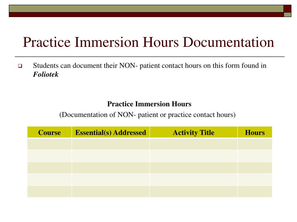 Practice Immersion Hours Documentation • Students can document their NON- patient contact hours on this form found in Foliotek Practice Immersion Hours (Documentation of NON- patient or practice contact hours)