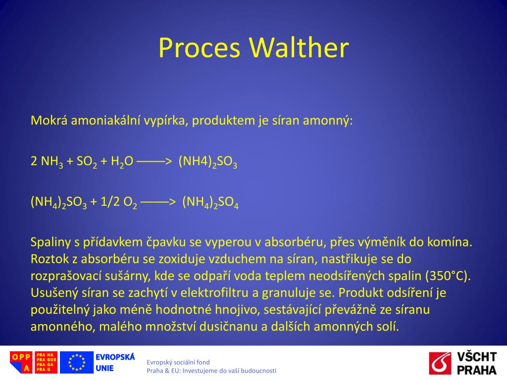 Proces Walther Mokrá amoniakální vypírka, produktem je síran amonný: 2 NH3 + SO2 + H2O────> (NH4)2SO3 (NH4)2SO3 + 1/2 O2────> (NH4)2SO4 Spaliny s přídavkem čpavku se vyperou v absorbéru, přes výměník do komína. Roztok z absorbéru se zoxiduje vzduchem na síran, nastřikuje se do rozprašovací sušárny, kde se odpaří voda teplem neodsířených spalin (350°C). Usušený síran se zachytí v elektrofiltru a granuluje se. Produkt odsíření je použitelný jako méně hodnotné hnojivo, sestávající převážně ze síranu amonného, malého množství dusičnanu a dalších amonných solí.
