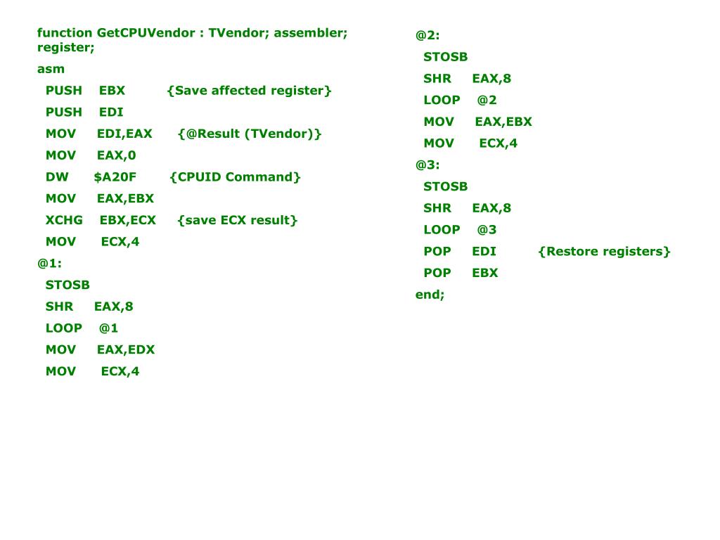 function GetCPUVendor : TVendor; assembler; register; asm PUSH EBX {Save affected register} PUSH EDI MOV EDI,EAX {@Result (TVendor)} MOV EAX,0 DW $A20F {CPUID Command} MOV EAX,EBX XCHG EBX,ECX {save ECX result} MOV ECX,4 @1: STOSB SHR EAX,8 LOOP @1 MOV EAX,EDX MOV ECX,4 @2: STOSB SHR EAX,8 LOOP @2 MOV EAX,EBX MOV ECX,4 @3: STOSB SHR EAX,8 LOOP @3 POP EDI {Restore registers} POP EBX end;