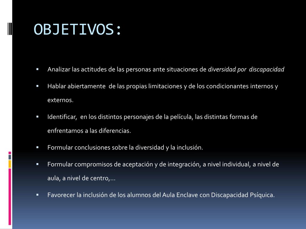 OBJETIVOS: • Analizar las actitudes de las personas ante situaciones de diversidad por discapacidad • Hablar abiertamente de las propias limitaciones y de los condicionantes internos y externos. • Identificar, en los distintos personajes de la película, las distintas formas de enfrentamos a las diferencias. • Formular conclusiones sobre la diversidad y la inclusión. • Formular compromisos de aceptación y de integración, a nivel individual, a nivel de aula, a nivel de centro,… • Favorecer la inclusión de los alumnos del Aula Enclave con Discapacidad Psíquica.
