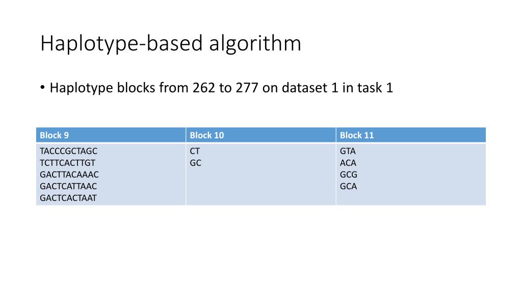 Haplotype-based algorithm • Haplotype blocks from 262 to 277 on dataset 1 in task 1