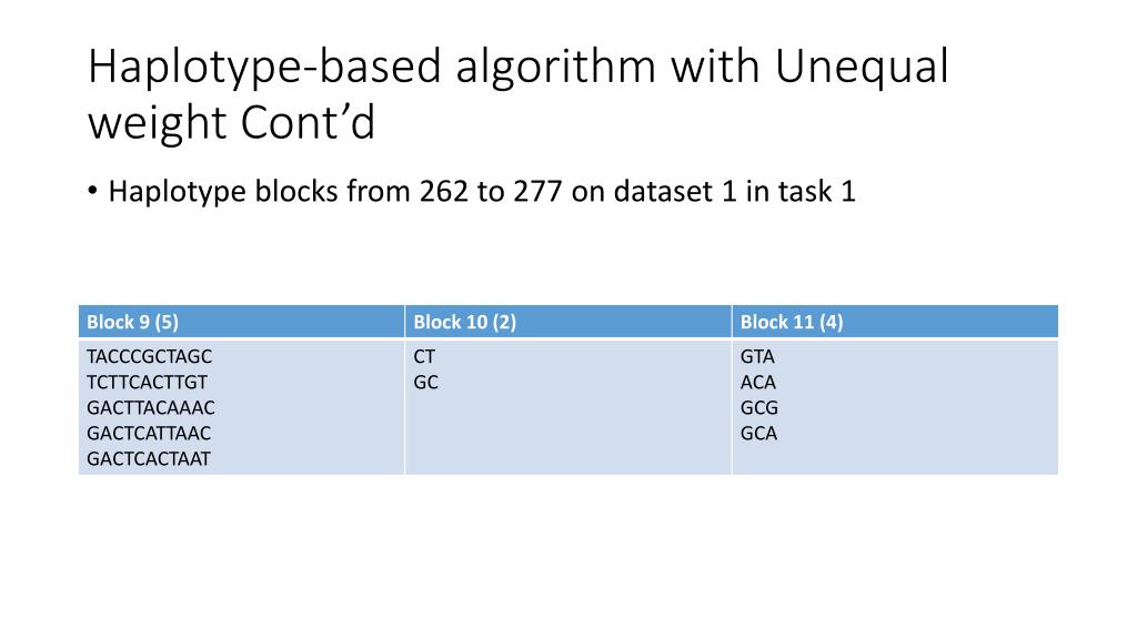 Haplotype-based algorithm with Unequal weight Cont’d • Haplotype blocks from 262 to 277 on dataset 1 in task 1
