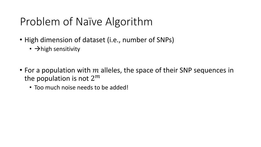Problem of Naïve Algorithm • High dimension of dataset (i.e., number of SNPs) • high sensitivity • For a population with alleles, the space of their SNP sequences in the population is not • Too much noise needs to be added!