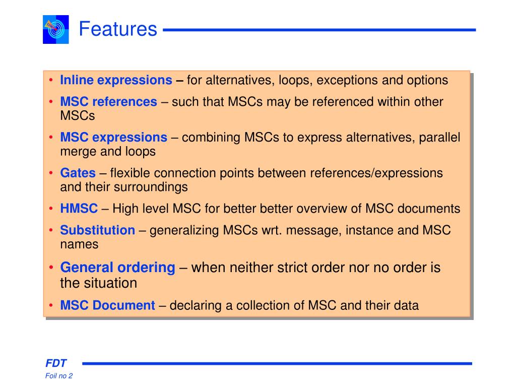 Features • Inline expressions – for alternatives, loops, exceptions and options • MSC references – such that MSCs may be referenced within other MSCs • MSC expressions – combining MSCs to express alternatives, parallel merge and loops • Gates – flexible connection points between references/expressions and their surroundings • HMSC – High level MSC for better better overview of MSC documents • Substitution– generalizing MSCs wrt. message, instance and MSC names • General ordering – when neither strict order nor no order is the situation • MSC Document – declaring a collection of MSC and their data