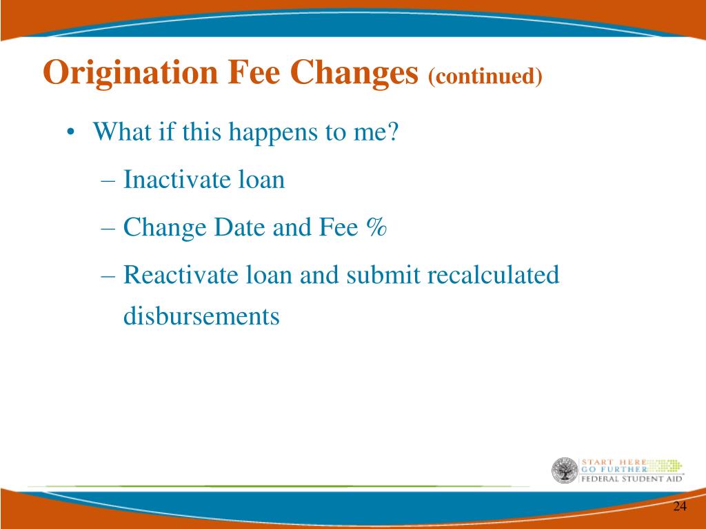 Origination Fee Changes (continued) Example 3: • Origination submitted with no actual disbursements • Loan amt = $3000, Origination Fee = 2.5%