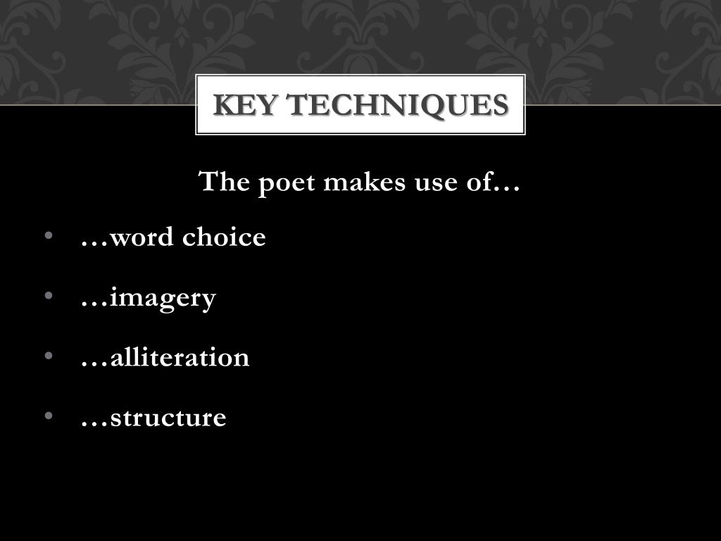 Key Techniques • The poet makes use of… • …word choice • …imagery • …alliteration • …structure
