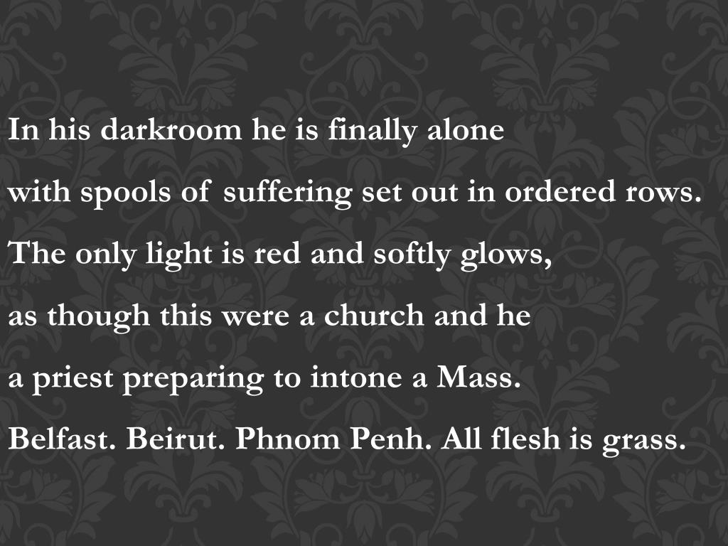 In his darkroom he is finally alonewith spools of suffering set out in ordered rows.The only light is red and softly glows,as though this were a church and hea priest preparing to intone a Mass.Belfast. Beirut. Phnom Penh. All flesh is grass.