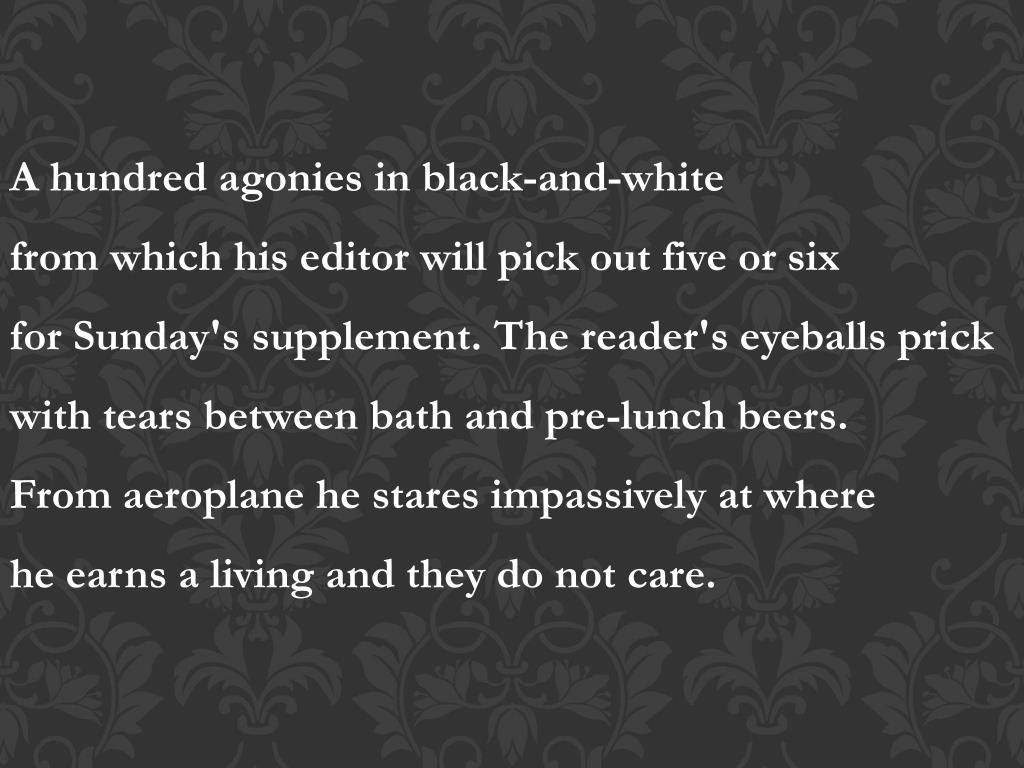 A hundred agonies in black-and-whitefrom which his editor will pick out five or sixfor Sunday's supplement. The reader's eyeballs prickwith tears between bath and pre-lunch beers.From aeroplane he stares impassively at wherehe earns a living and they do not care.