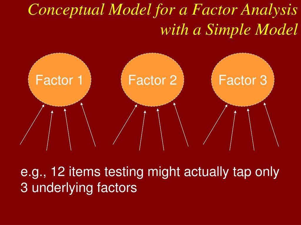 Factor 1 Factor 2 Factor 3 Conceptual Model for a Factor Analysis with a Simple Model e.g., 12 items testing might actually tap only 3 underlying factors