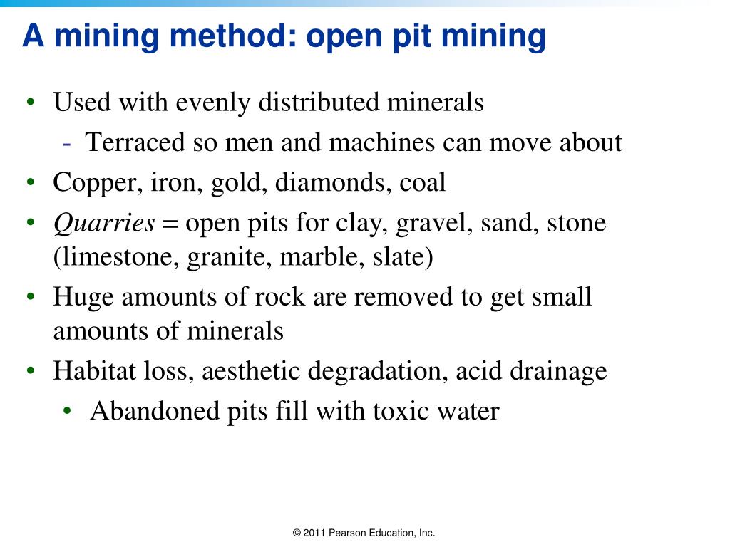 A mining method: open pit mining • Used with evenly distributed minerals • Terraced so men and machines can move about • Copper, iron, gold, diamonds, coal • Quarries = open pits for clay, gravel, sand, stone (limestone, granite, marble, slate) • Huge amounts of rock are removed to get small amounts of minerals • Habitat loss, aesthetic degradation, acid drainage • Abandoned pits fill with toxic water