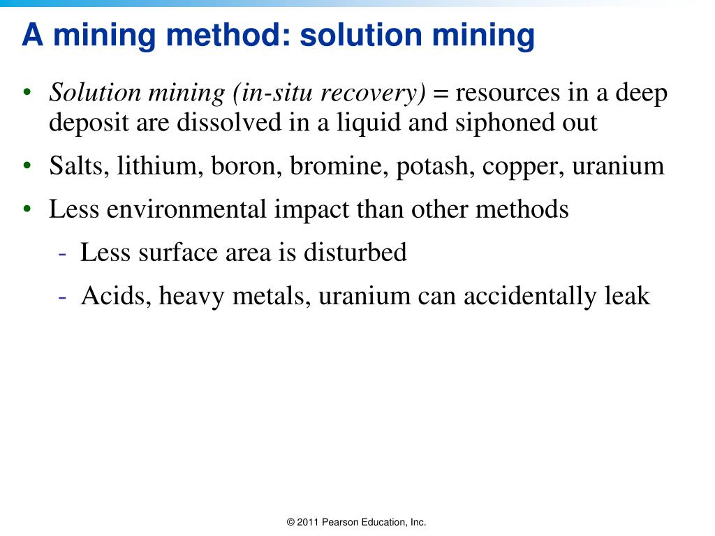 A mining method: solution mining • Solution mining (in-situ recovery) = resources in a deep deposit are dissolved in a liquid and siphoned out • Salts, lithium, boron, bromine, potash, copper, uranium • Less environmental impact than other methods • Less surface area is disturbed • Acids, heavy metals, uranium can accidentally leak