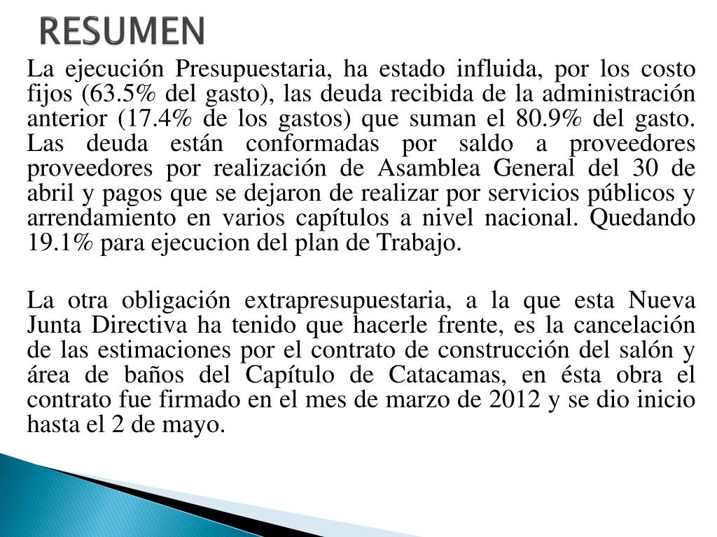 RESUMEN La ejecución Presupuestaria, ha estado influida, por los costo fijos (63.5% del gasto), las deuda recibida de la administración anterior (17.4% de los gastos) que suman el 80.9% del gasto. Las deuda están conformadas por saldo a proveedores proveedores por realización de Asamblea General del 30 de abril y pagos que se dejaron de realizar por servicios públicos y arrendamiento en varios capítulos a nivel nacional. Quedando 19.1% para ejecucion del plan de Trabajo. La otra obligación extrapresupuestaria, a la que esta Nueva Junta Directiva ha tenido que hacerle frente, es la cancelación de las estimaciones por el contrato de construcción del salón y área de baños del Capítulo de Catacamas, en ésta obra el contrato fue firmado en el mes de marzo de 2012 y se dio inicio hasta el 2 de mayo.