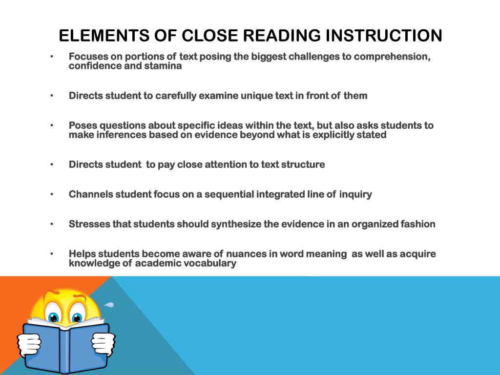 Elements of Close Reading Instruction • Focuses on portions of text posing the biggest challenges to comprehension, confidence and stamina • Directs student to carefully examine unique text in front of them • Poses questions about specific ideas within the text, but also asks students to make inferences based on evidence beyond what is explicitly stated • Directs student to pay close attention to text structure • Channels student focus on a sequential integrated line of inquiry • Stresses that students should synthesize the evidence in an organized fashion • Helps students become aware of nuances in word meaning as well as acquire knowledge of academic vocabulary