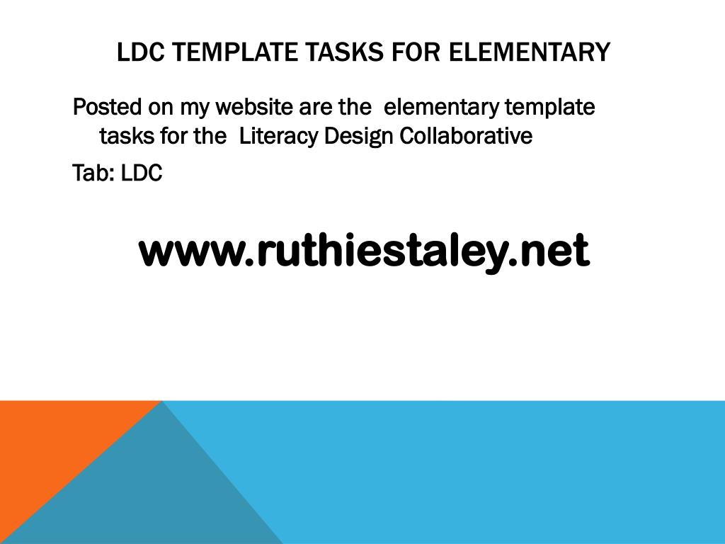 LDC Template Tasks for Elementary • Posted on my website are the elementary template tasks for the Literacy Design Collaborative • Tab: LDC • www.ruthiestaley.net